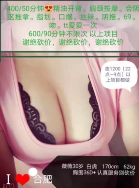 前段时间去合肥出差 微信联系的妹子 先打车到地方 拍照电梯 妹子给你发公寓房间号 进去之后懂得都懂 20分钟 ...